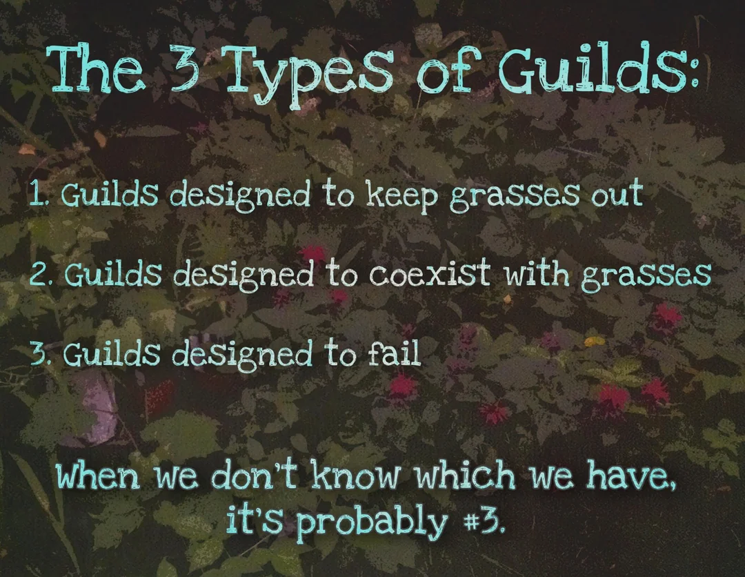 A good modern 101 course on guilds will start with the ”First Rule of Guilds.” (See picture) In the image this applies to ”grass,” but really it is about whatever “resident vegetation” you have. If you have creeping Charlie, or sour grass, then the first rule of guilds applies to those.