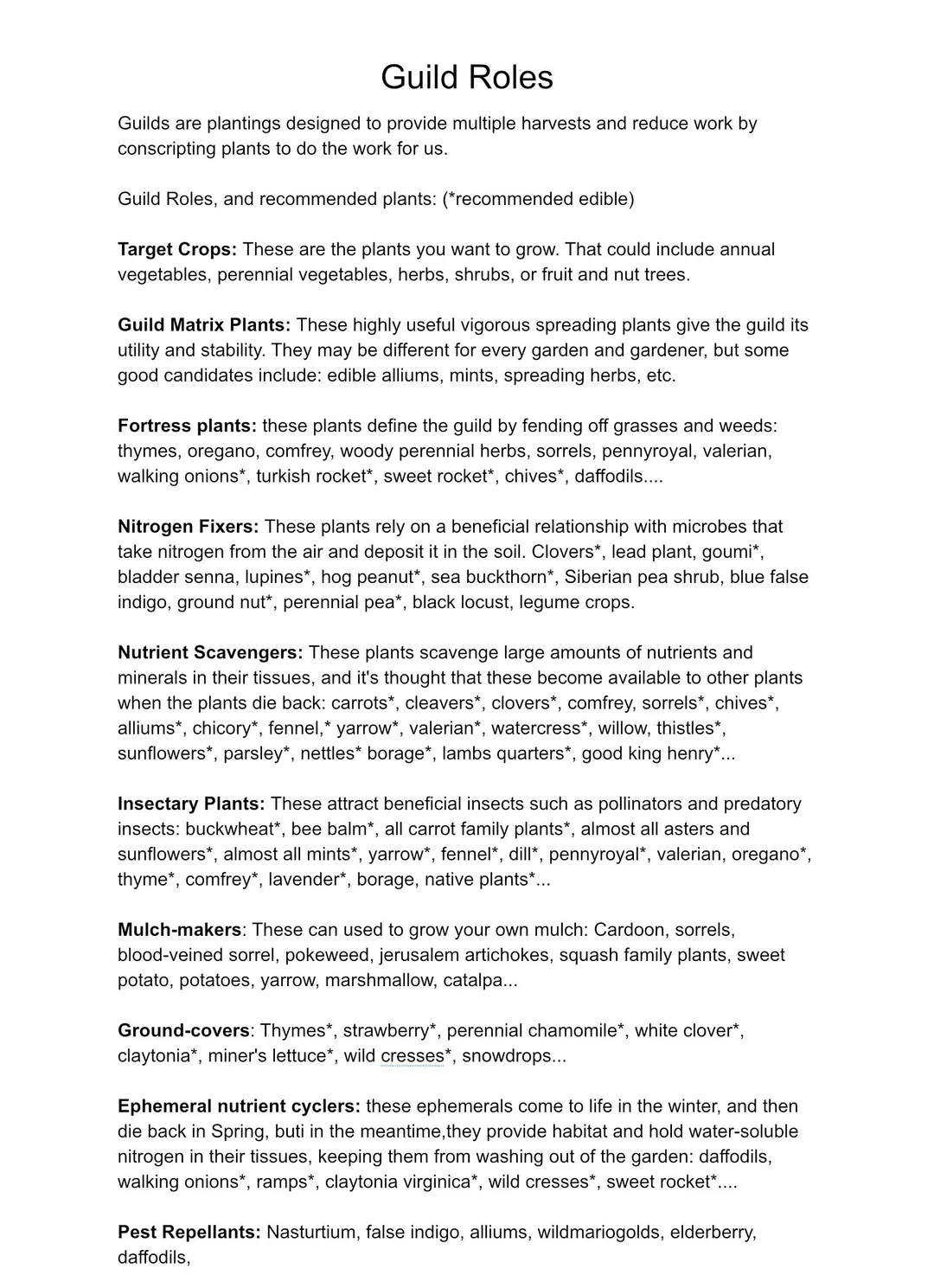 With these down, guild role theory can help us design very low labor. The idea of guild roles is to try to copy some of the things we can observe in wild plant communities. A second way of thinking about it is that we can think of all the kinds of work we would be doing in the garden, and try to recruit plants to do that work for us. That includes pollination, pest and weed prevention, and even conserving water. Keep in mind, guild roles are not a scientific concept, but a design tool. Because we can‘t really ever know all the roles a plant will fulfill in a real ecosystem! But we can use guild theory to try to increase biodiversity and cover some of the basics.
